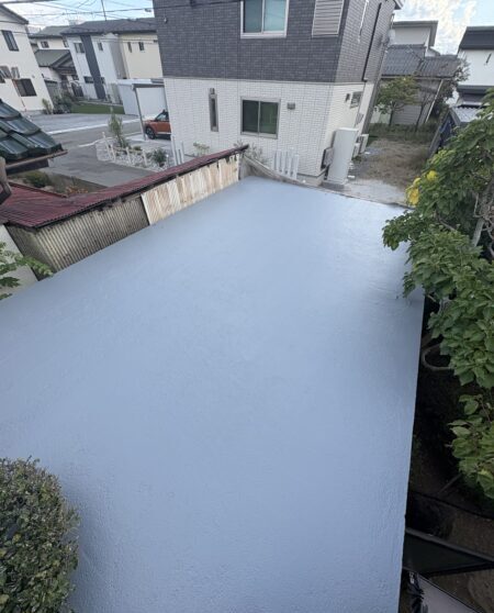 2枚目写真の屋根は、雨風はもちろん紫外線に強い塗料で塗り上げました。