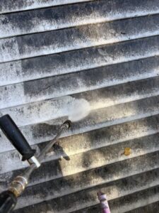 まずは、高圧で水を噴射する高圧洗浄機でこびりついた汚れを落とします!