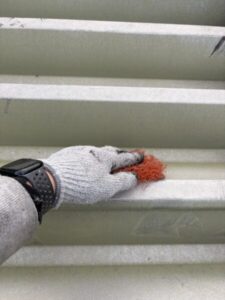 写真は、粗目の研磨たわしで表面をまんべんなく擦り、微細な凹凸を金属に施して、塗料の食いつきをよくします。